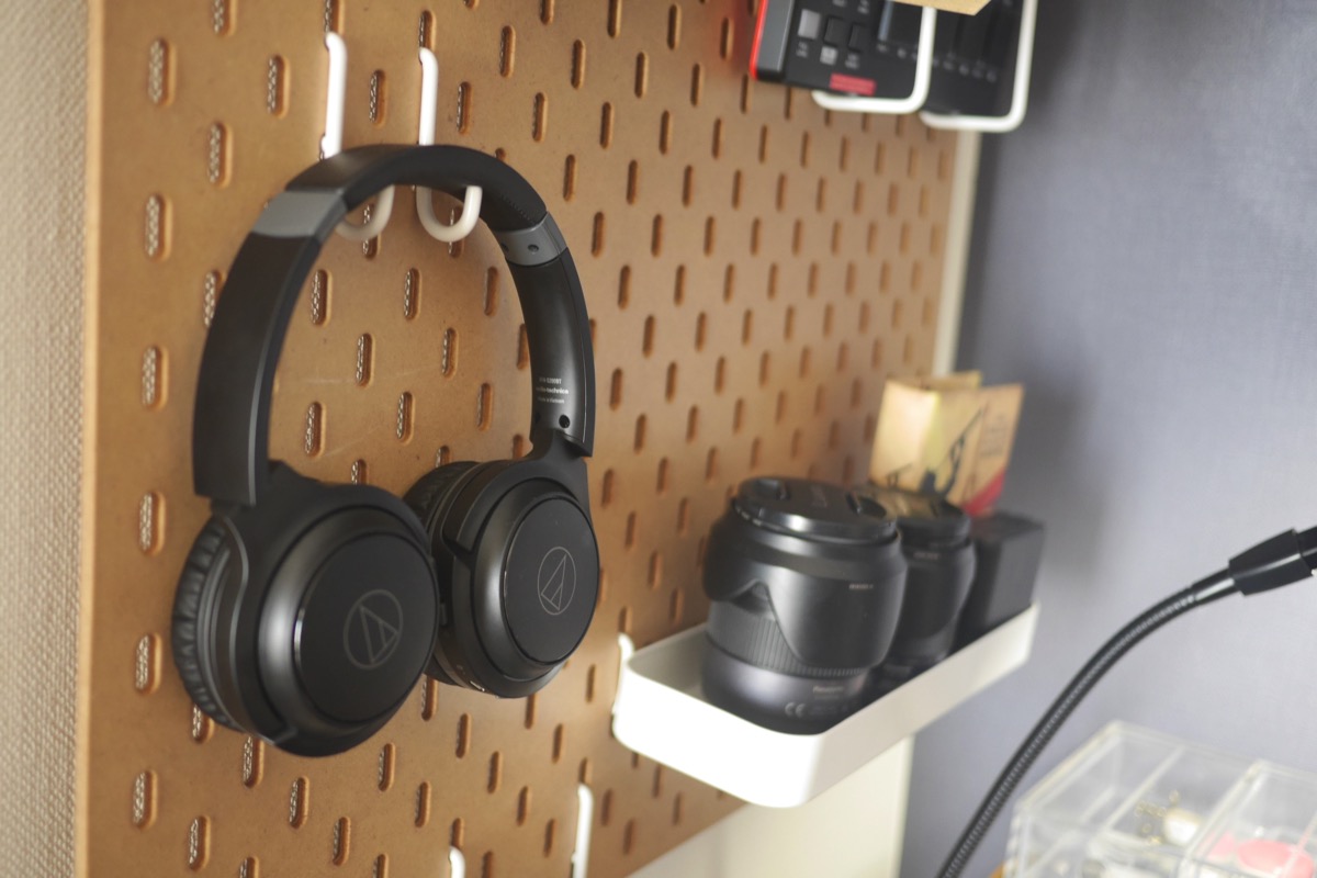 ペグボードにかけて収納。ワイヤードと違ってケーブルの収納が煩わしくないのがよい。ヘッドの部分を横にできるのでDJプレイをする方も使えるかもしれません(しないけど)