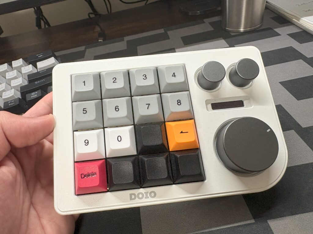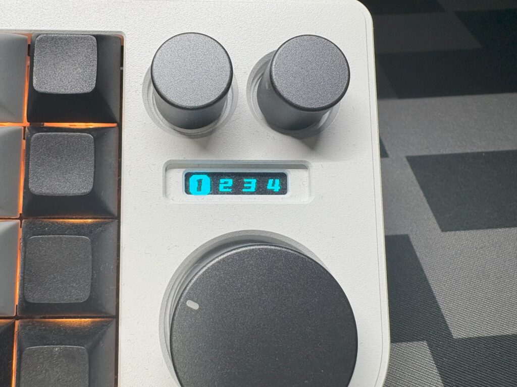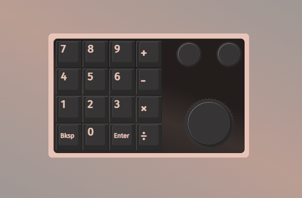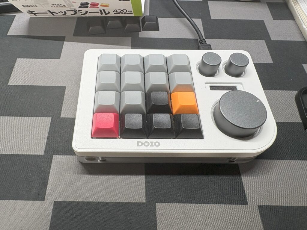 印字が何も無いキーが4×4にレイアウトされ、右側にはくるくる回して押し込めるロータリースイッチが3つ。